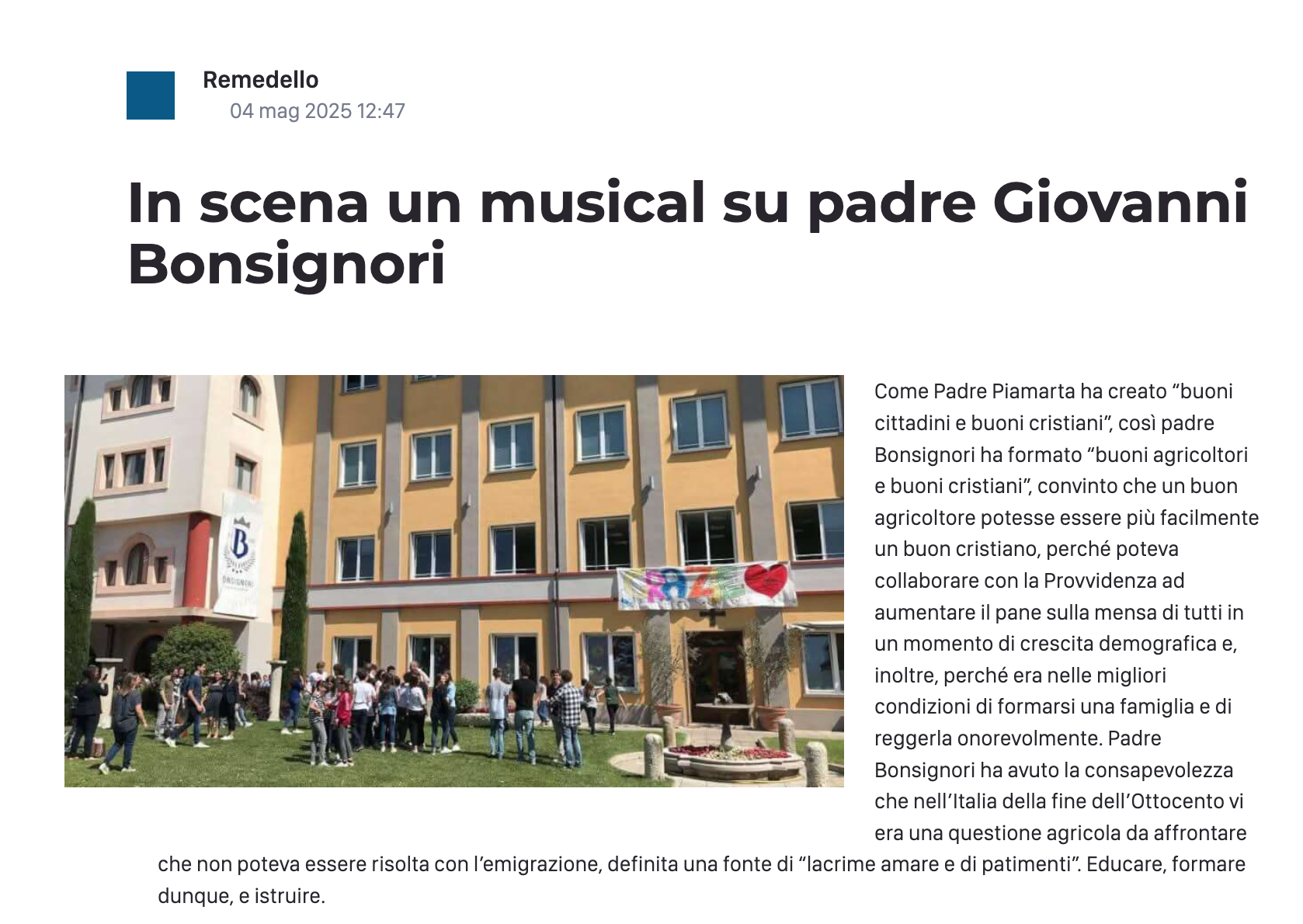 In occasione del 130° anniversario di fondazione dell’ istituto, venerdì 9 maggio, nel Teatro parrocchiale Don Germano Germani di Remedello Sopra, ha debuttato il musical “Date loro da mangiare”, scritto da Osvaldo Romano e musicato dal maestro Francesco Andreoli sulla vita di padre Giovanni Bonsignori