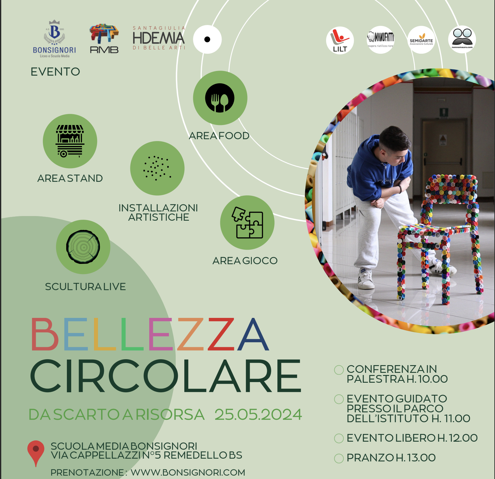 Spesso ci viene detto " si sa, gli artisti vivono nel loro mondo"; ognuno ha dentro di sé doni e capacità che porta verso una dimensione personale, ma il mondo è di tutti. E soprattutto … le cose belle si fanno insieme. È giunto il momento di riscoprire il piacere di incontrarsi attraverso un evento e di mettere in moto meccanismi virtuosi di riconoscimento delle potenzialità creative in grado di produrre bellezza, una bellezza che è di tutti e parla a tutti. La prima bellezza è la location: lo splendido parco naturalistico della scuola, che diventa, per un giorno, galleria d’arte contemporanea. Arte fruibile a tutti, accompagnata e guidata attraverso le parole dei mini artisti che l'hanno studiata e realizzata. Arricchiscono l’evento con stand, attività ed esposizioni: iManufatti da Flero e i suoi oggetti particolarmente creativi, Marilena Ardesi da Gambara con un mercatino di vestiti a sostegno della ricerca, Ezio Cavagnini da Montichiari che accompagnerà live alcuni studenti nel mondo dello scultore del legno e Nonno Mauro da Bedizzole con i suoi bellissimi giochi di legno ecosostenibili. Una delle installazioni sarà frutto di una mattinata dell'arte condotta dagli studenti di Arti Visive dell'Hdemia di Belle Arti Santa Giulia di Brescia con gli alunni di 3A e 3B.